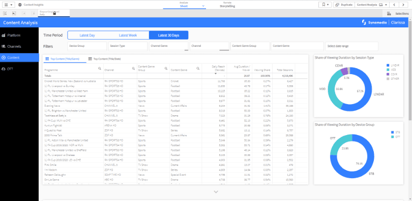 Many dashboards also provide filters that when applied on any one sheet will carry-over to all the sheets within the application. This allows you to look at the impact a particular filter is having on all other dashboards. For example, the “Sports” Content Genre can be a filter to see its impact on not just Channel Importance, but also on Platform Reach and OTT Device Reach as well.