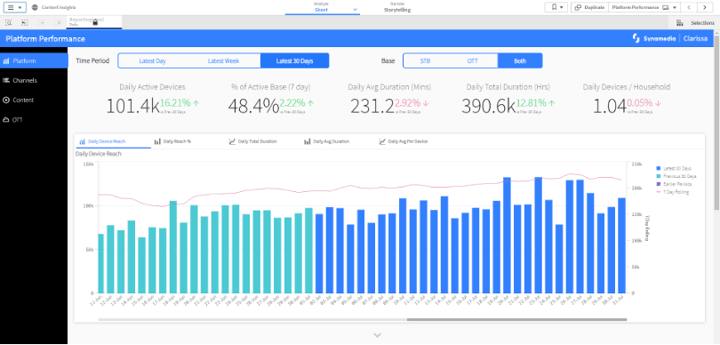 This sheet brings together high-level statistics on device reach and viewing duration across all content and channels on a service provider’s platform. Headline metrics provide a quick view on system-wide consumption trends for reach and duration. Additional panels look at service types and devices per household. Filters allow you to select the time period for analysis and also the devices whose performance you want to understand.