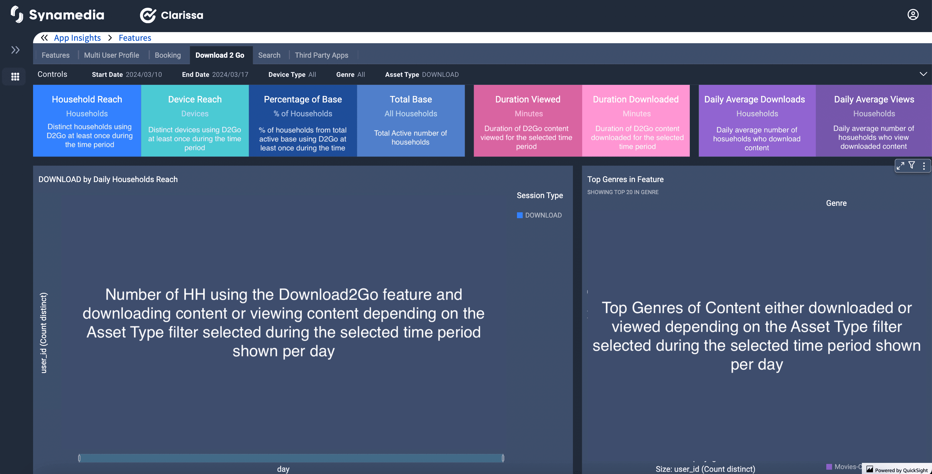 Filters for device group (Main, Companion, both), device type (specific type of device), Session type and Genres are provided to refresh the numbers and charts across the dashboard. Default selections for filters will always be Both Device Groups, all session types and all Genres. An additional filter which is critical for Download 2 Go is the Asset type filter which is set as a default to downloaded but can also be changed to viewed. This asset will apply to charts but the headline metrics cover both asset type behaviour already.