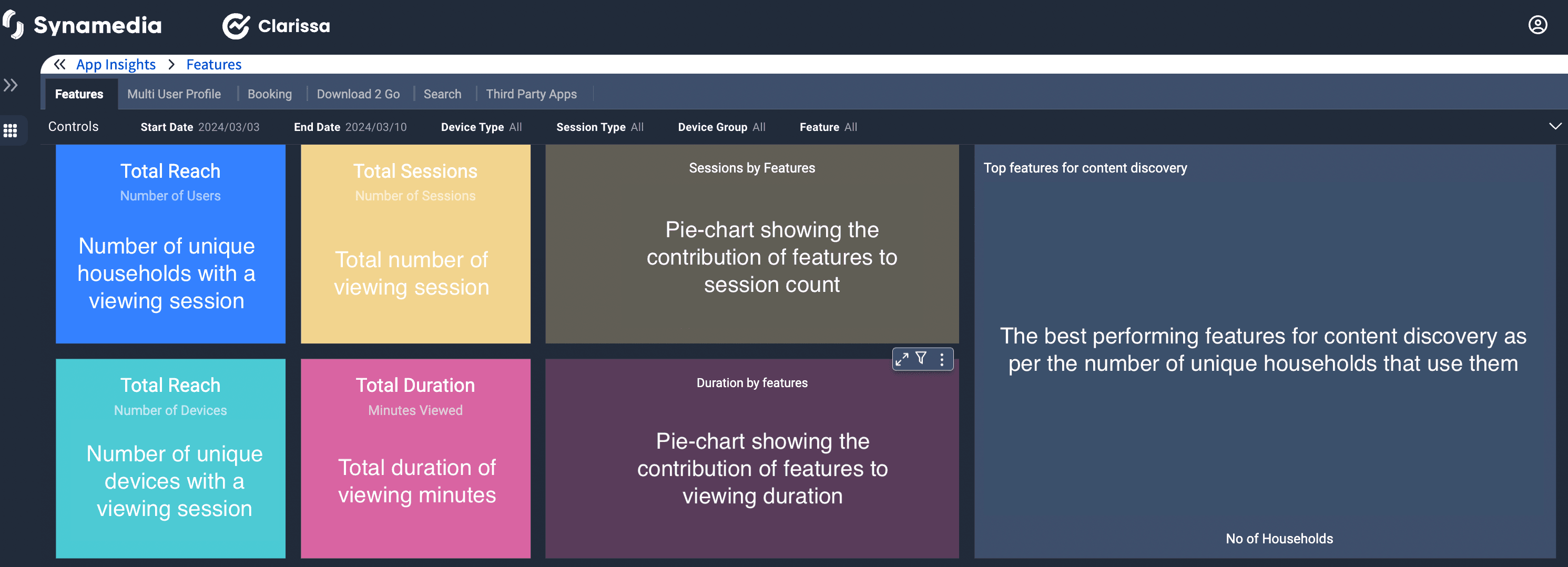 The final part of the Features main tab sheet focuses on the detailed breakdown of each feature by household reach, session count and session viewing duration.