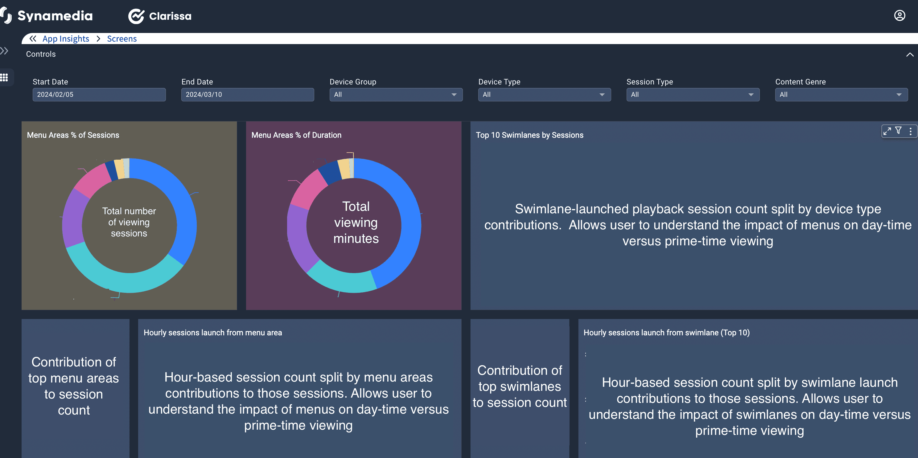When examining swimlanes, particularly across various device types with distinct aspect ratios/screen sizes, it is valuable to observe the impact of swimlane popularity based on device types. Hourly trends This is an hour-based session count split by either menu areas (left) or swimlane (right) contributions to those sessions. This chart allows users to understand the impact of menus or swimlanes on daytime versus prime time viewing and the likely demographic preferences this might indicate. Insight Trends A new introduction to new Clarissa dashboards is the creation of dynamic boxes that offer insights into the impact of UI on number the of number of viewing sessions.