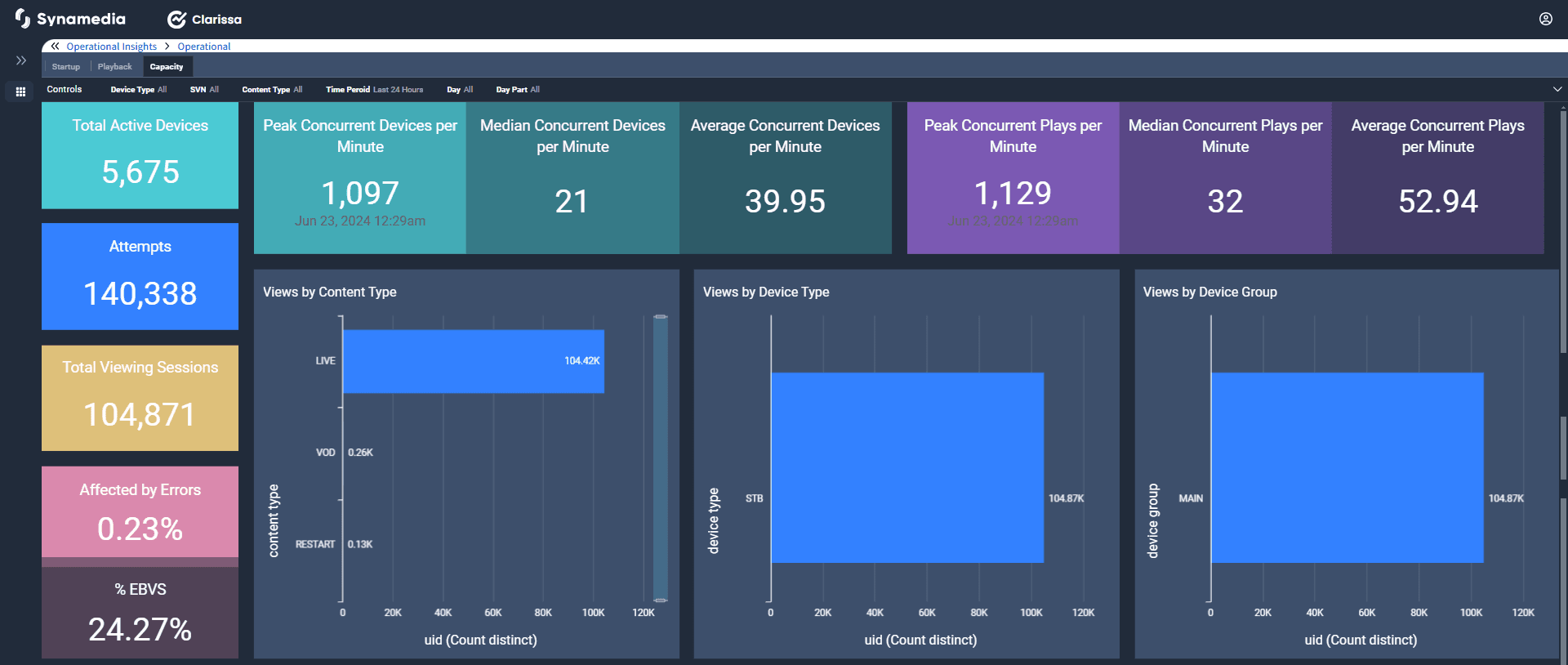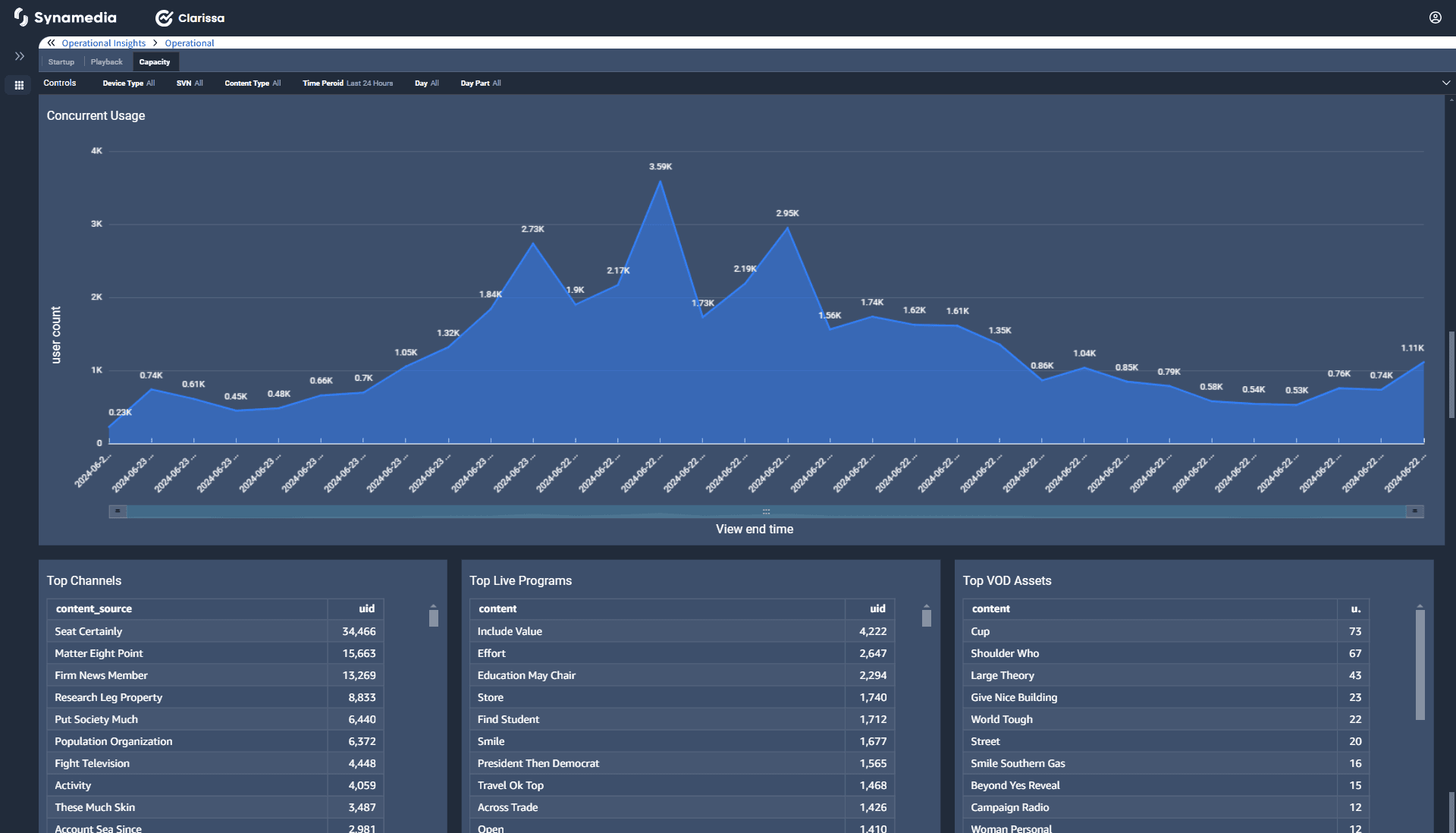 The Capacity Dashboard provides a real-time view of system load, concurrent device activity, and content consumption trends. This dashboard helps operators monitor infrastructure performance, track peak usage patterns, and optimize service capacity to ensure seamless content delivery.