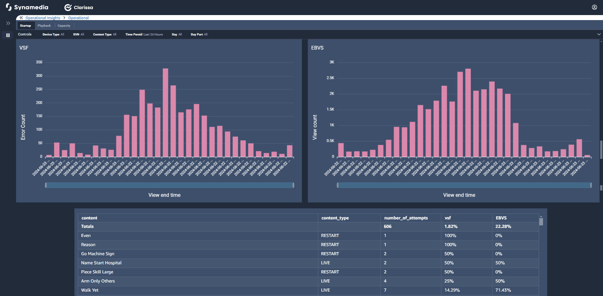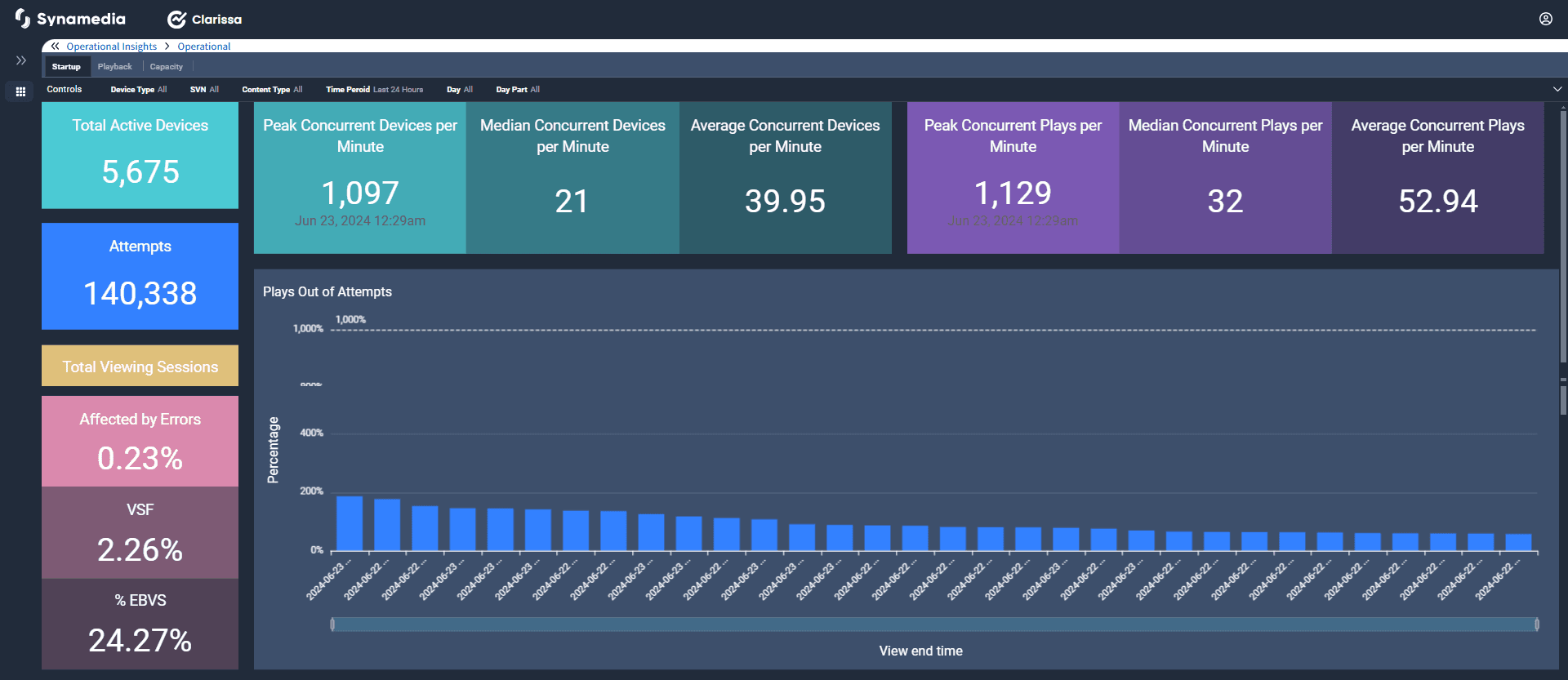 Plays out of attempts (Bar Chart): A visual representation of play success rates out of the total startup attempts over time. Helps operators identify periods with lower success rates and investigate causes (e.g., network congestion, authentication failures).