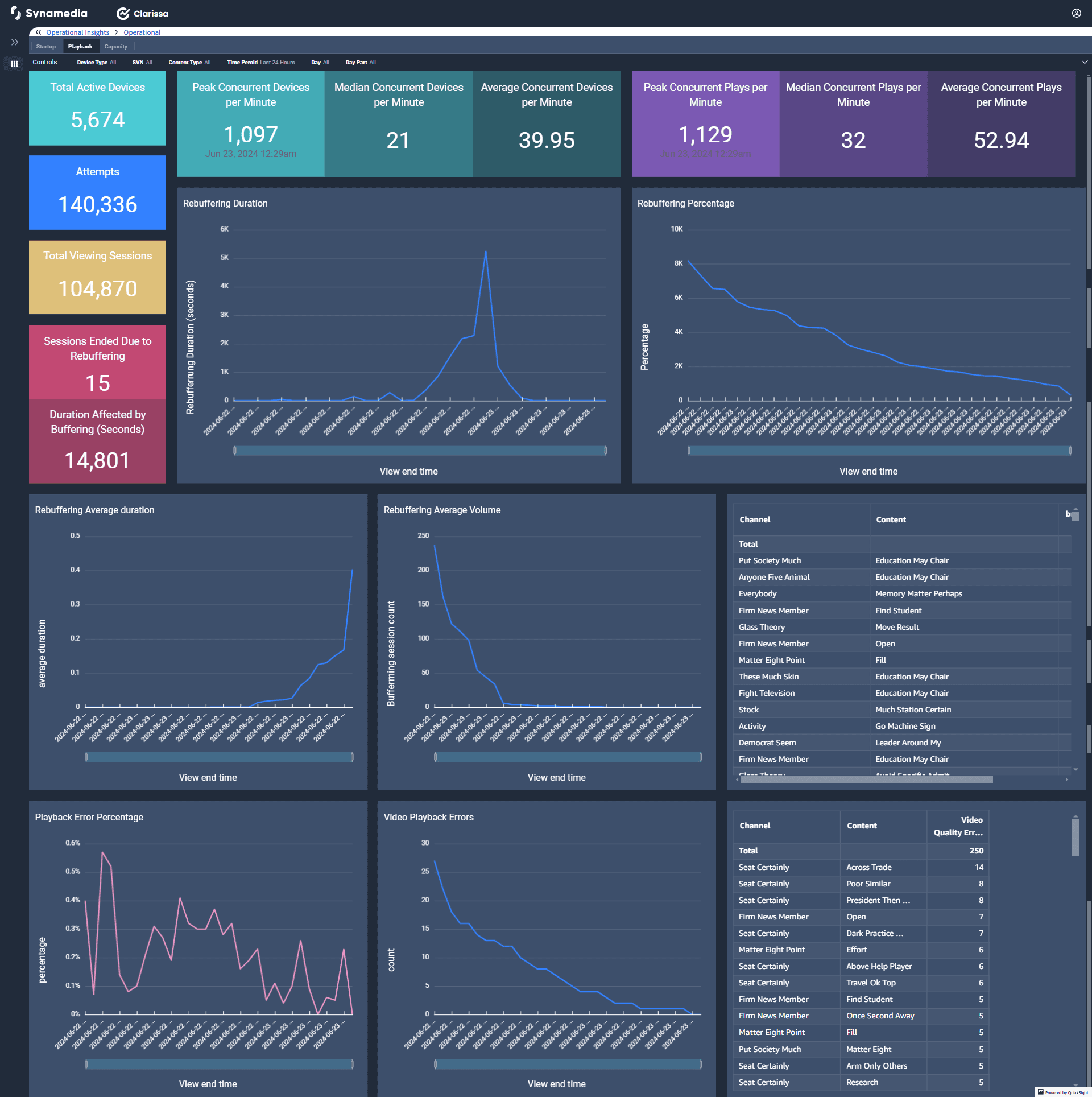 The Playback Dashboard provides a detailed analysis of video playback performance, focusing on key metrics related to buffering, playback errors, and video quality. It enables operators to monitor user experience, identify performance bottlenecks, and proactively optimize content delivery to ensure a seamless viewing experience.