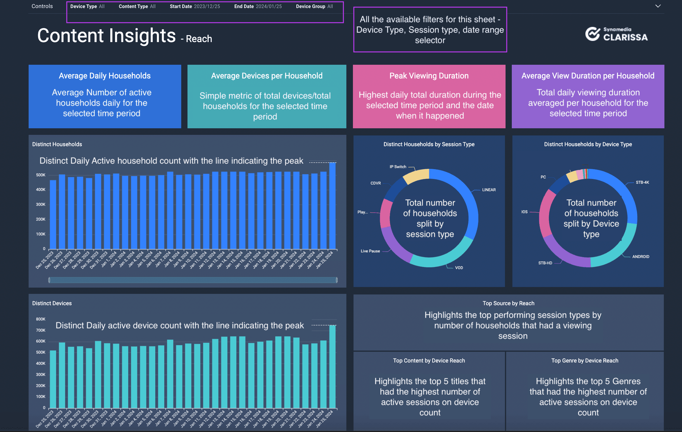In the top section of Reach where the focus is entirely on Device and HH count, we look at the best performing (top 5) Content, Genre and Content Source that has had the most active device reach.