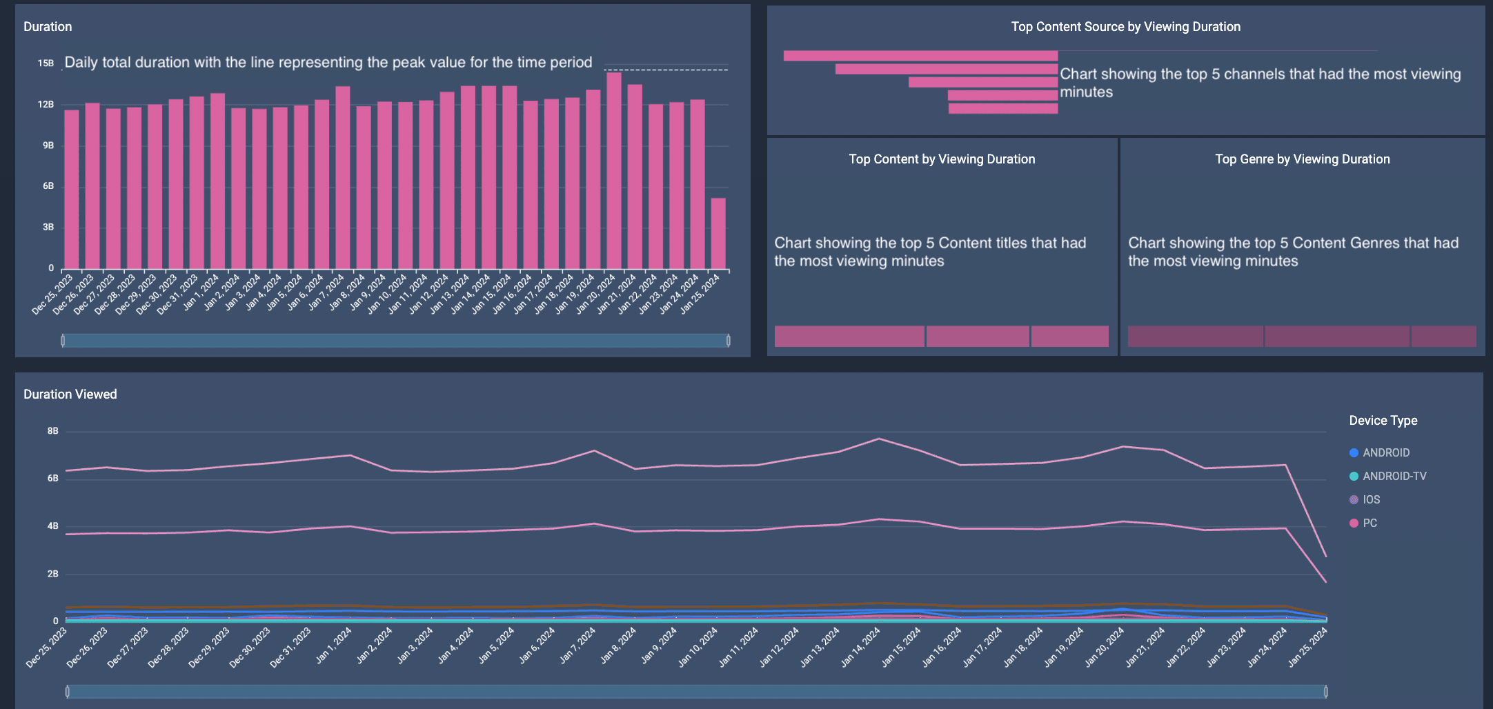 We feature a daily chart depicting total viewing minutes, followed by three Insights trends related to Viewing Duration. Additionally, there is a a chart illustrating the daily breakdown of total viewing minutes by device type.